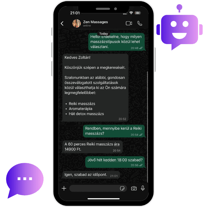 A nap 24 órájában dolgozó legjobb értékesítőd, aki azonnal válaszol, előszűri a leadeket és időpontot foglal a naptáradba. Sosem fárad el, így te a stratégiai feladatokra koncentrálhatsz, amíg ő dolgozik.